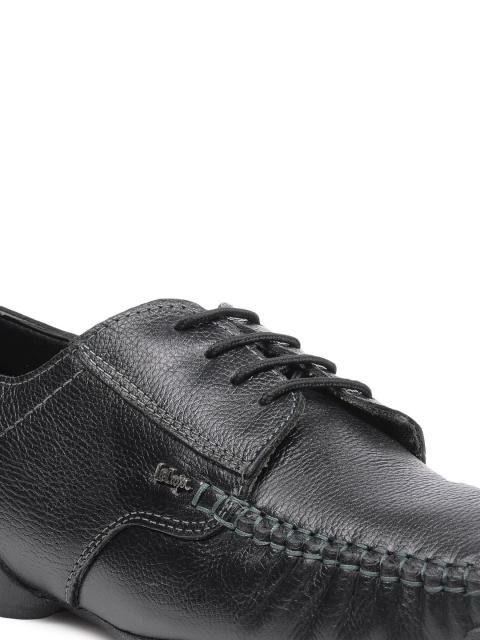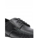 Black round toed slip on shoes with ruffles at the seams of the toe box