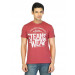 Red round neck T-shirt made of 100% cotton, has short sleeves and graphic print on the chest