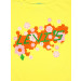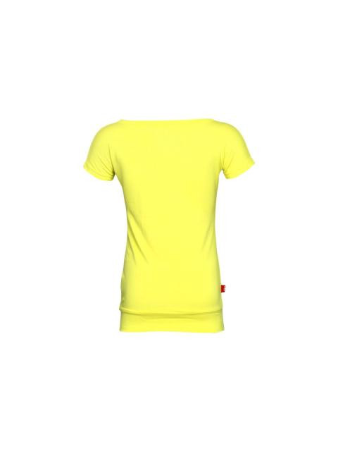 Yellow boat neck top made of 100% cotton, with right shoulder button panel, short sleeves, chest print in pearly effect with suede branding and an extra panel at the end of the length for a gathered Fit