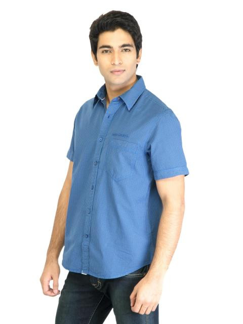 Blue and brown check shirt made of 100% cotton, has half sleeves, spread collar with a full front button placket, pocket on the left chest, and a curved hem