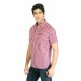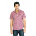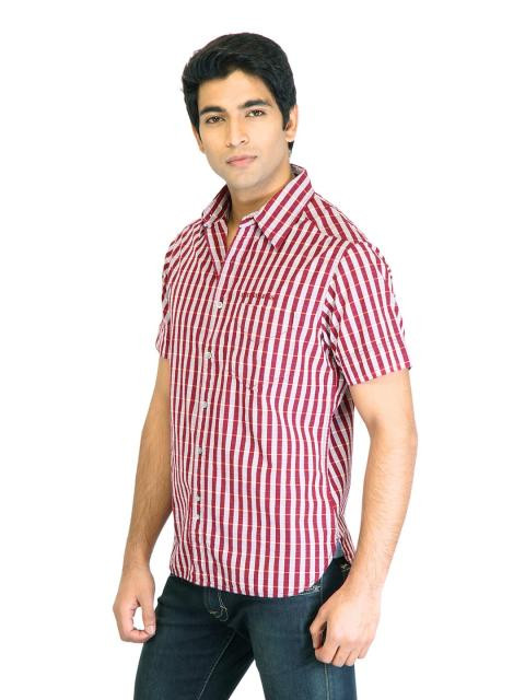 Red and grey check shirt made of 100% cotton, has half sleeves, spread collar with a full front button placket, pocket on the left chest with branding, stitch detailing on the front, half sleeves, and a curved hem