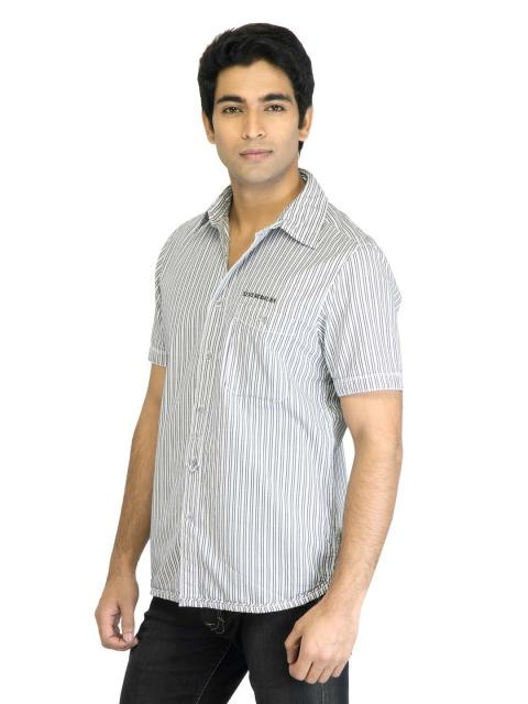 Grey and blue striped shirt made of 100% cotton, has pocket on the left chest, half sleeves, brand mark on the left pocket, and a curved hem