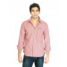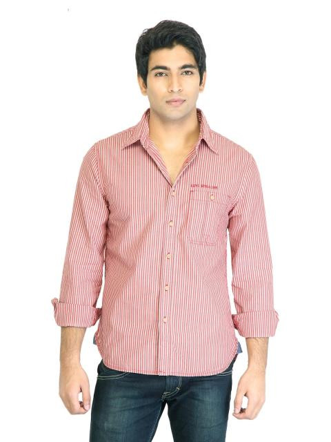 Red and cream striped shirt with brown accents, made of 100% cotton, has full sleeves, spread collar with a full front button placket, pocket on the left chest with branding, and a curved hem