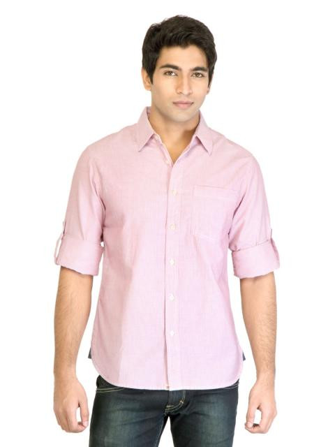 Red and white striped shirt made of 100% cotton, has a spread collar with a full front button placket, pocket on the left chest, full sleeves and a curved hem