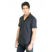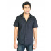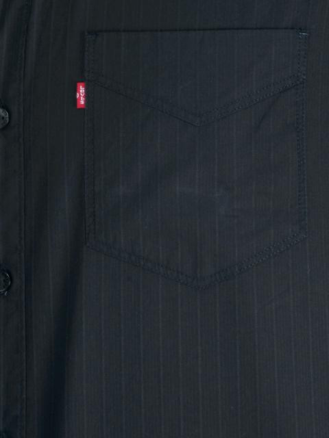 Black shirt with striped accents, made of 100% cotton, has half sleeves, spread collar with a full front button placket, pocket on the left chest with branding, half sleeves, and a curved hem