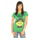 Green round neck T-shirt with short sleeves, made of 100% cotton, has fabric tape detailing on the inseam of the neckline and graphic print on the front with lettering in a slightly distressed look