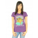 Purple round neck t-shirt with short sleeves, made of 100% cotton, has fabric tape detailing on the inseam of the neckline and graphic print on the front with lettering in a slightly distressed look