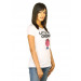 White round neck t-shirt with short sleeves, made of 100% cotton, has fabric tape detailing on the inseam of the neckline and graphic print on the front with lettering in a slightly distressed look