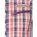 Half sleeve shirt made of 100% cotton, has black and orange plaid checks with white and blue accents, tape detailing on the inseam of the collar, foldover cuffs with pink gingham piping details, appliqued patch over right sleeve, patch pockets on the chest with zippered closure, appliqued badge on top of the left chest pocket, full length buttoned placket with a snap button at the end and with pink gingham facing placket lining and curved hemline