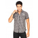 Half sleeve shirt made of 100% cotton, has black, white and grey plaid checks, tape detailing on the in-seam of the collar, patch pocket on the left chest with buttoned closure and with embroidered brand name on top, full length buttoned placket with black tape detailing on the facing placket at the end and curved hemline