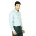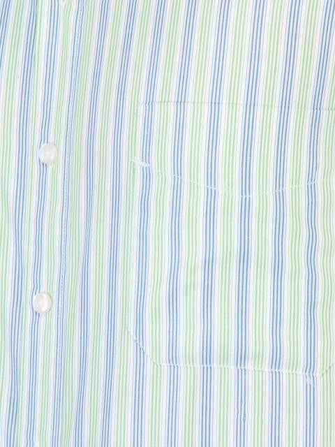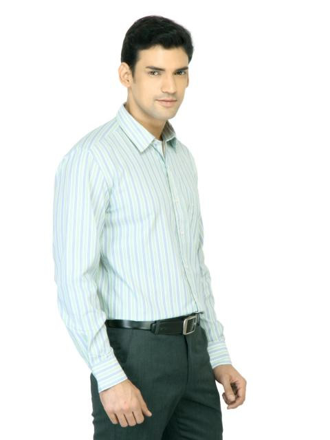 White shirt with blue and green stripes, made of blended cotton, has full sleeves with double buttoned cuffs, medium spread slim collar, buttoned placket with pearlescent white buttons, patch pocket on the left chest with stitch detailing and a curved hem