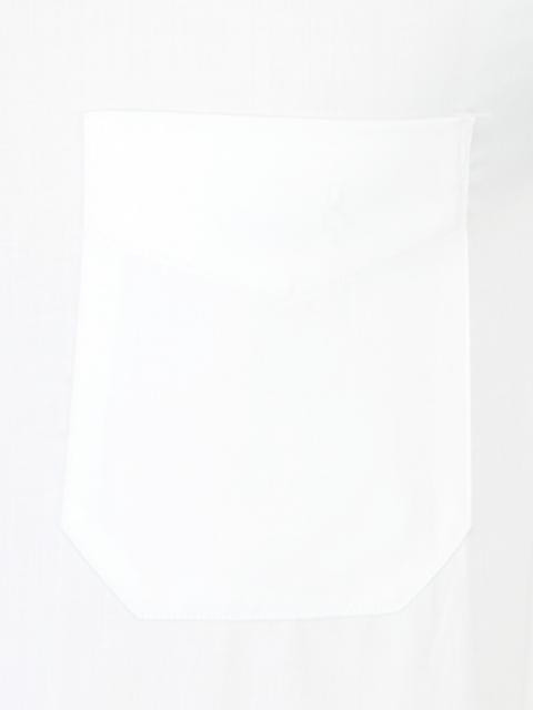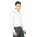 Crisp white shirt, made of blended cotton, has full sleeves with double buttoned cuffs, spread collar, buttoned placket with pearlescent white buttons, patch pocket on the left chest with stitch detailing and a curved hem