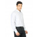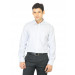 White shirt with dashed navy stripes, made of blended cotton, has full sleeves with double buttoned cuffs, medium spread slim collar, buttoned placket with pearlescent white buttons, patch pocket on the left chest with stitch detailing and a curved hem