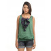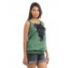 Green sleeveless top, has a round neckline, blue patterned binding around the neckline and armholes, ruffle detail below the neckline and smocking at the hemline