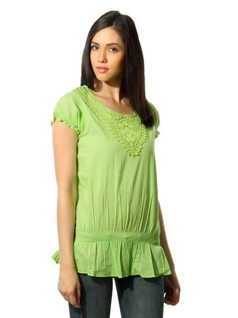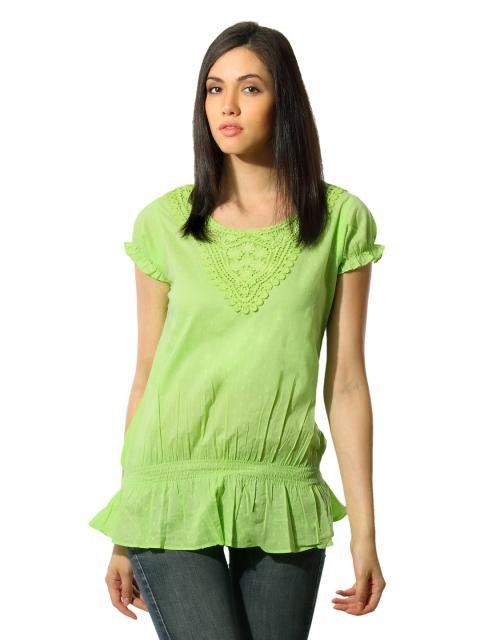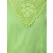 Lime green tunic style top, has a round neck with crochet lace detailing, puffed sleeves with elasticated cuffs, elasticated waist and a ruffled hem