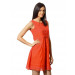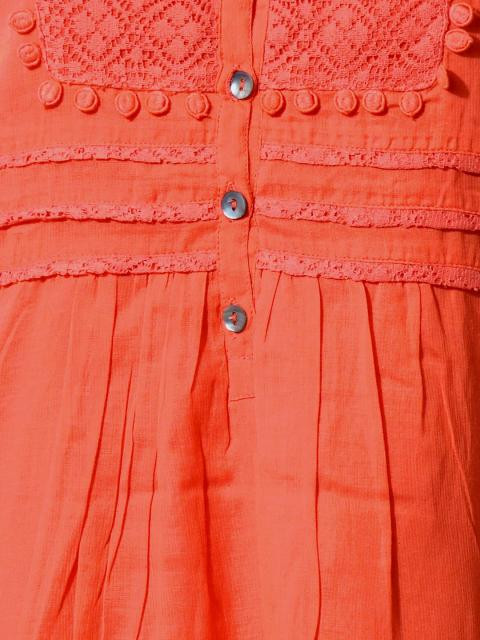 Deep coral colour sleeveless dress, has a round neck with spread collar, buttoned placket, lace detailing on the yoke and hem, tucks on the waist and back