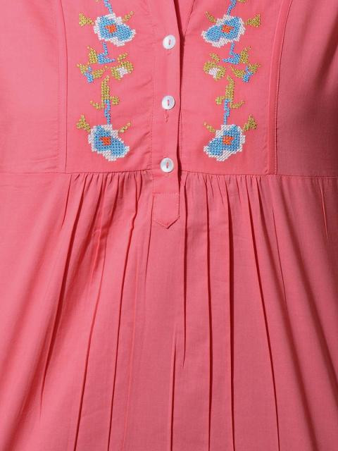 Deep coral colour top, has a mandarin collar with split neck, three quarter length sleeves, three-buttoned placket, cross-stitch detailing on the yoke, smocking on the shoulders and tucks on the chest