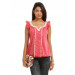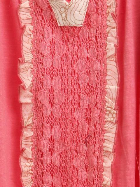 Pink top with a split neckline, is sleeveless with ruffles on the arm hole, ruffle detailing along the neckline and the nape, lace detailing on the front and elasticated smocking at hem