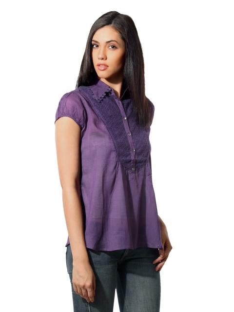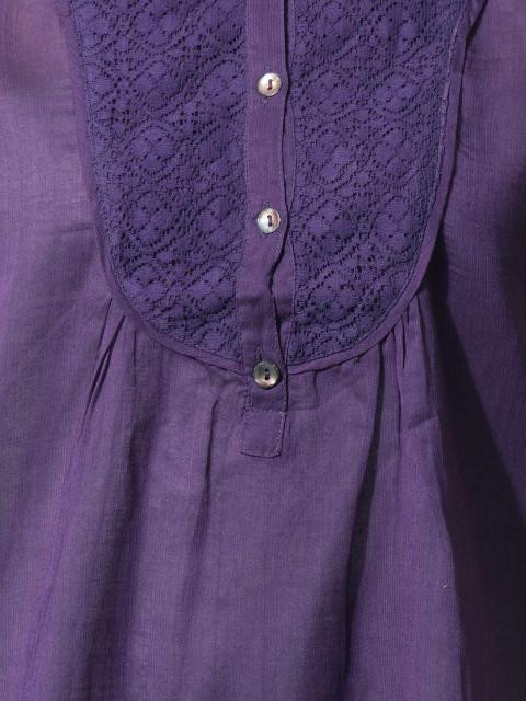 Deep purple colour top, has a spread collar with lace detailing, buttoned placket, puffed sleeves, lace detailing on the yoke