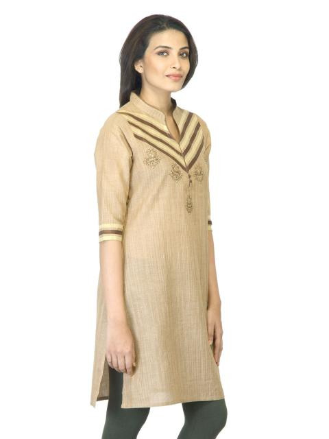 Two tone brownish beige kurta made of 100% cotton, has a mandarin collar with a split neckline, three quarter sleeves, tape detail, button detail and embroidery on the chest and a vented hem