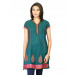 Blue V-neck kurta, has short sleeves, ruffle detail above the neckline, tape detail along the neckline, mock buttoned placket, appliqué work above the hem and a vented hem