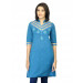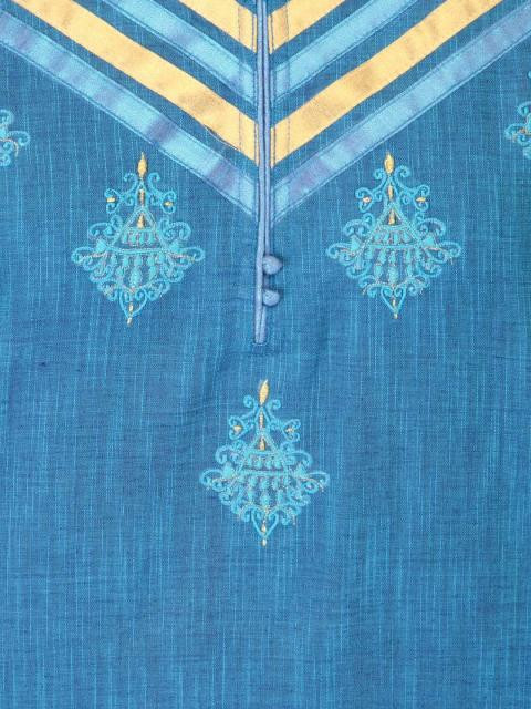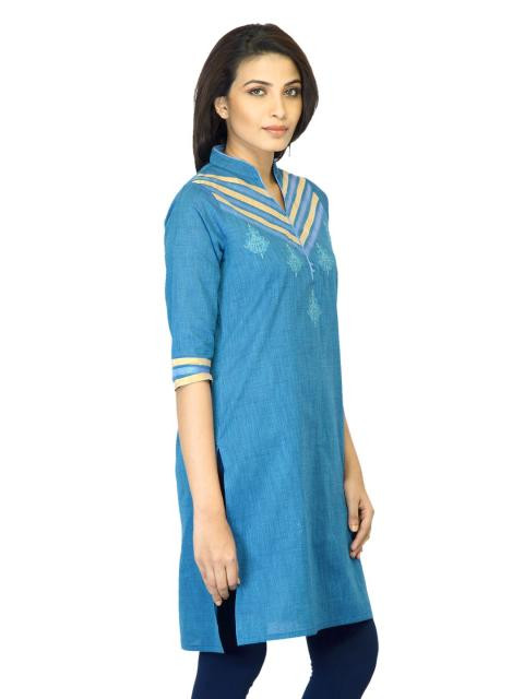 Two tone blue kurta made of 100% cotton, has a mandarin collar with a split neckline, three quarter sleeves, tape detail, button detail and embroidery on the chest and a vented hem