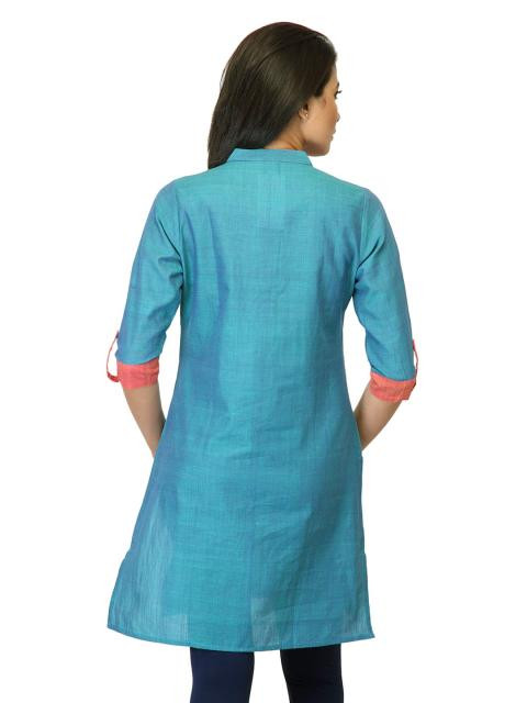mother earth's focus on providing livelihoods for rural artisans resulted in this handmade kurta that fuses earthy goodness with a modern cut and silhouette. This piece epitomises how fashion, vintage styling and comfort unite to create the perfect Indian tunic. Those interested in colour blocking can wear this with bright contrasting capris or pants. Others who want to keep their look classic and chic can pair this with tonal leggings and embellished slippers.