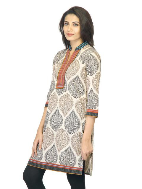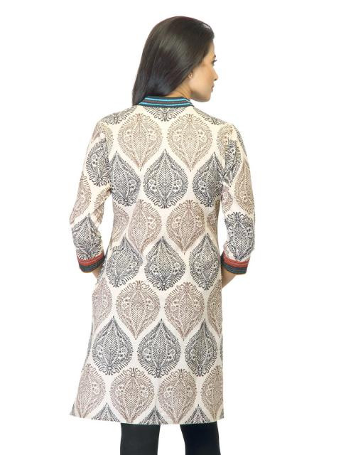 Cream printed round neck kurta made of 100% cotton, has a split neckline, panel stitched on the yoke, sequin detail along the neckline, three quarter sleeves and a vented hem