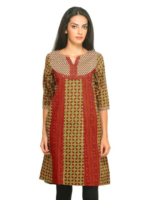 Olive and red printed kurta made of cotton fabric, has a slit neckline, sequin on the front, three quarter sleeves with piping on the cuffs and a curved hem
