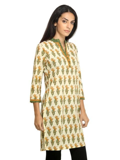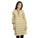 Yellow printed kurta made of cotton fabric, has a mandarin collar with a slit neckline, three quarter sleeves with piping on the cuffs, half buttoned placket with fabric covered buttons and a vented hem