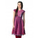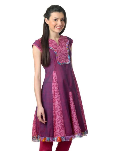 Dark pink kurta made of 100% cotton, has a split neckline, short sleeves, contrast panelling on the front, lacing on the chest, curved hem, has a flaring skirt with no side slits.