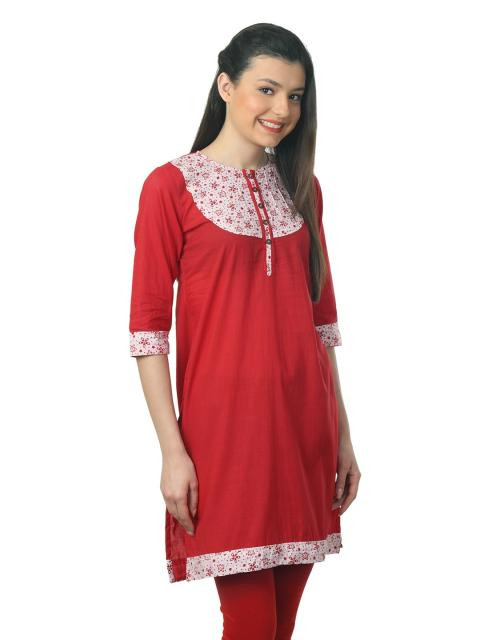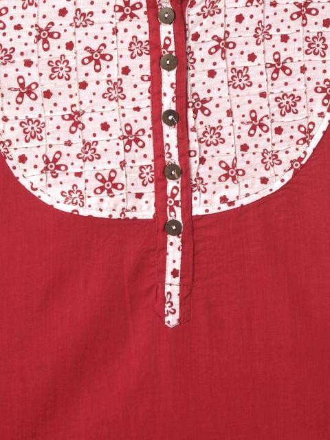 Red kurta made of 100% cotton, has a round neck, chest buttoned placket, three fourth sleeves, criss-cross pintucks on the chest, contrast panelling on the chest, cuffs and hem and has a vented hem