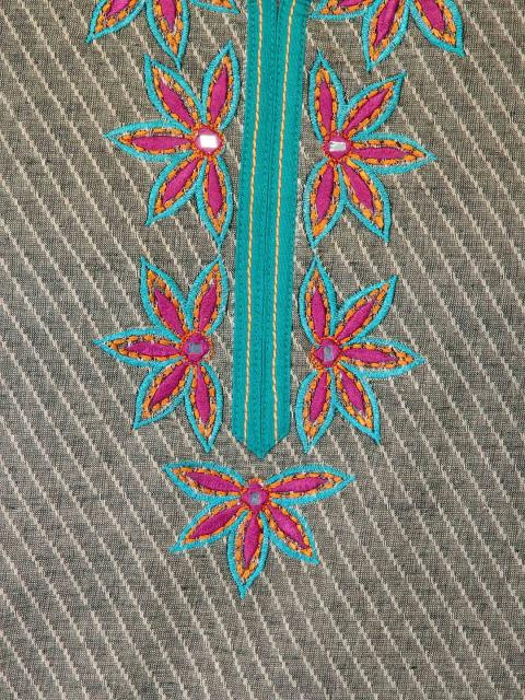 Grey V-neck kurta made of 100% cotton, has tape detail along the neckline, embroidery and mirror work on the chest, diagonal stripe detail all over, short sleeves and a vented hem