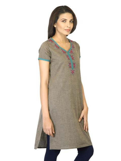 mother earth's focus on providing livelihoods for rural artisans resulted in this handmade kurta that fuses earthy goodness with a modern cut and silhouette. This piece epitomises how fashion, vintage styling and comfort unite to create the perfect Indian tunic. Those interested in colour blocking can wear this with bright contrasting capris or pants. Others who want to keep their look classic and chic can pair this with tonal leggings and embellished slippers.