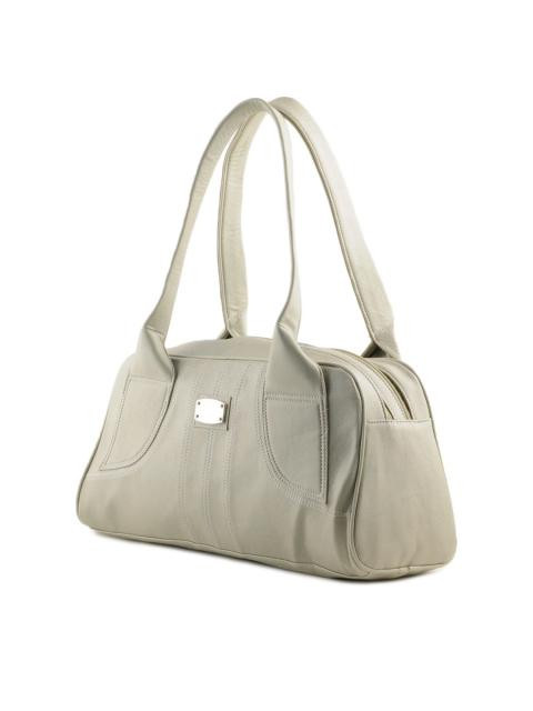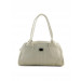 Beige handbag, contrast stitched detailing on the upper, metallic plate embellishment, two zipped compartments, inner zipped pocket , two short handles, one external zipped pocket