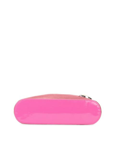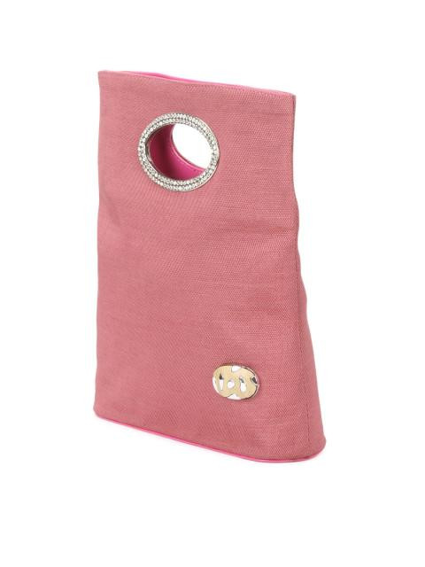 One main compartment with one zipped pocket and a metallic handle design cut through the top with crystal embellishments and a magnetic buttoned closure