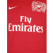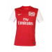 Red Arsenal jersey made of 100% recycled polyester Dri Fit mesh like fabric, that has round neckline with red ribbing, short white sleeves with red rubber print stripe from the shoulders to the middle of the sleeve, Arsenal club seal on the upper left chest in rubber print, swoosh logo embroidered on the upper right chest, Fly Emirates written in rubber print below the swoosh and authentic jock tag at left hem
