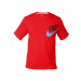 Red round neck t-shirt made of Dri-Fit cotton fabric, with short sleeves, and heat transferred nike swoosh on left sleeve and graphic on left chest