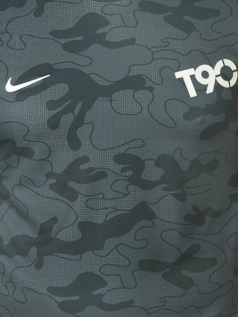 Grey round neck training t-shirt made of 100% polyester Dri-Fit fabric, with sublimated print, heat transfer swoosh logo and T90 lettering on the chest, mesh back panel, short sleeves and contrast tape at side seam