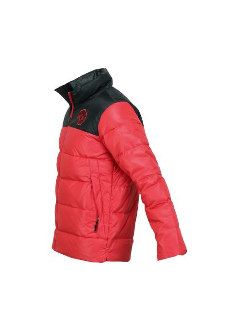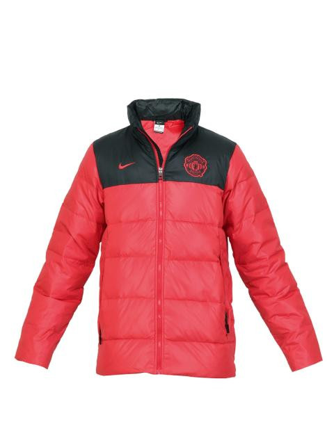 Red jacket with an upper body made of 100% polyester in black, lower body and long sleeves made of 100% nylon in red, lining made of 100% polyester in red, mock neck, 550 Fill Down made of 75% grey duck down and 25% feathers, soft fleece cuffs extending from sleeve openings, two hand-warmer pockets at the front, zipped internal pocket for your ipod with a cord manager, trims, zipper pulls and cord locks made of recycled waste materials, nike swoosh and manchester united badge embroidered in red on the chest and Manchester United embroidered on the back