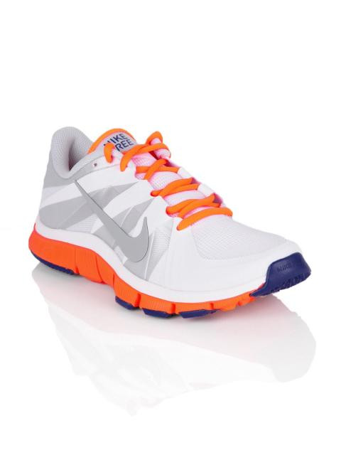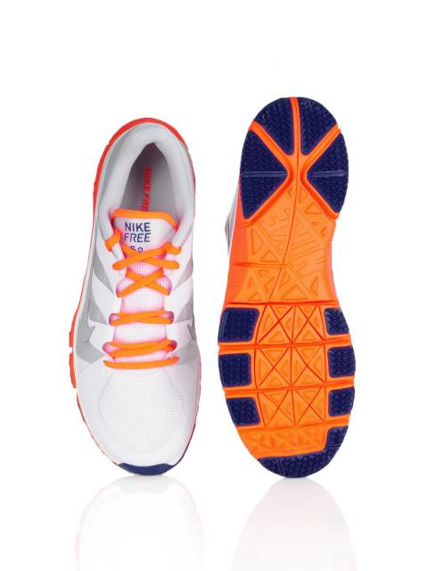 Ultra light, durable and flexible, the nike Free Trainer 5.0 is constructed with a seamless upper fixated with light-weight layers of Hyperfuse material. The upper on these switches between white and reflective silver, with a streak of matte silver in the swoosh. The underside is brighter, with a primarily neon orange outsole that gets hits of purple on the outer traction pods. The nike Free Trainer 5.0 delivers a flexible, sock-like Fit, excellent support and multi-surface traction that stands up to abuse during field drills, running or lifting.