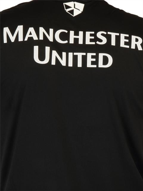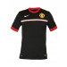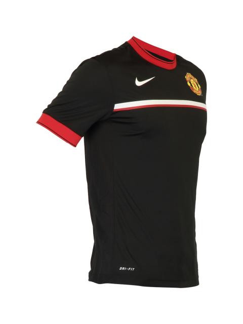 Black manchester united jersey made of 100% polyester Dri-Fit fabric that has a round neckline with red ribbing and black tipping, red ribbed sleeve cuffs with black tipping, Manchester United badge on the upper left chest, swoosh logo on the upper right chest, red and white rubber print horizontal stripe on the upper chest below the swoosh and the seal, mesh panels on the side seams made of 100% polyester and rubber print of the words - Manchester United and seal on the back