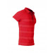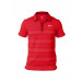 Red polo neck t-shirt with white and red stripes, made of 88% polyester and 12% spandex Dri-Fit fabric, has short sleeves, twill collar with lining and buttoned chest placket, lining along shoulder flap area, heat transferred swoosh logo on left shoulder blade and vented hem