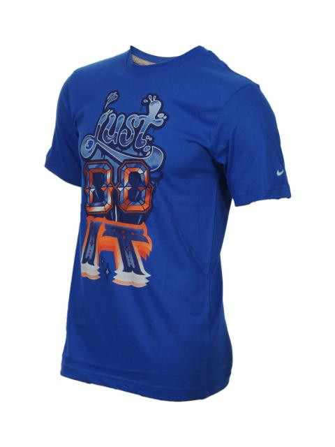Blue crew neck t-shirt made of 100% cotton, has short sleeves, fabric tape on inseam of the neckline, graphic print on the chest and nike swoosh on left sleeve