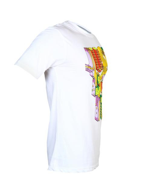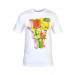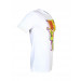 White round neck short sleeved t-shirt made of 100% cotton, with a graphic print on the front and grey fabric tape on inseam of the neckline