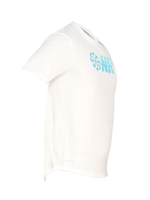White raglan sleeved jersey made of Dri-Fit polyester, with chest print of Dri-fit logo in blue and nike heat transfer swoosh
