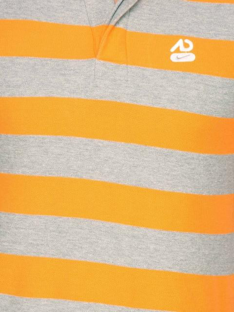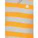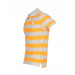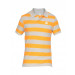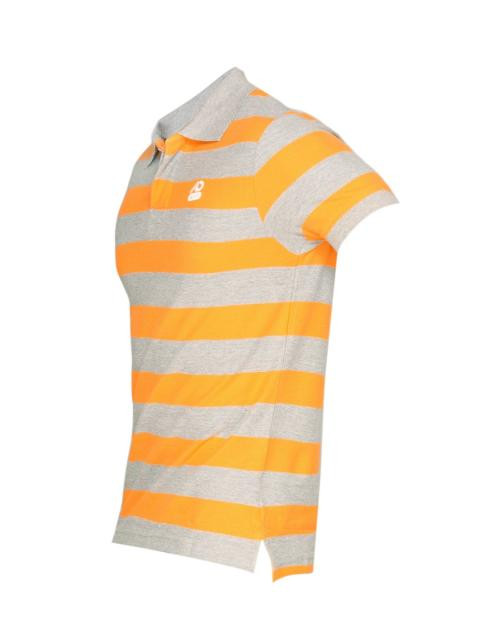 Orange and grey short sleeve polo neck t-shirt made of 100% cotton with horizontal orange and white stripes, vented hem, concealed button placket, ribbed collar and cuff, grey fabric tape on inseam of collar and embroidered logo on left chest