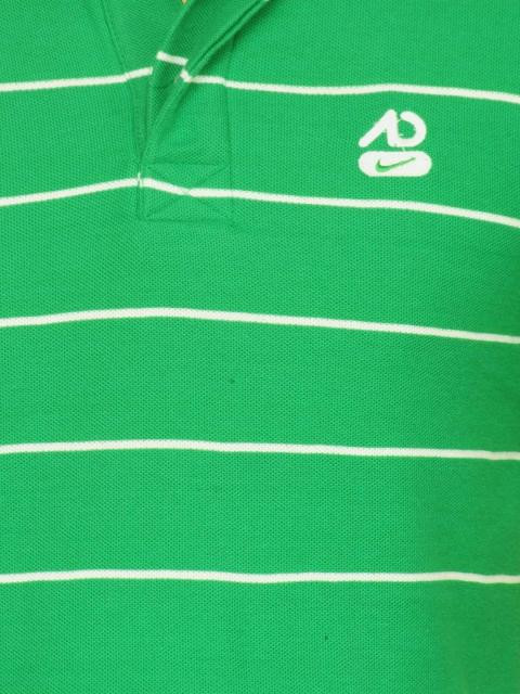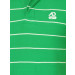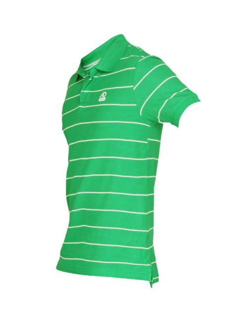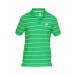 Green and white short sleeve polo neck t-shirt made of 100% cotton with horizontal pinstripes in green and white, vented hem, concealed button placket, ribbed collar and cuff, grey fabric tape on inseam of collar and embroidered logo on left chest