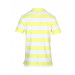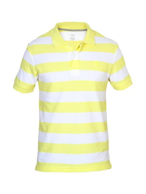 Yellow and white short sleeve polo neck t-shirt made of 100% cotton, has horizontal yellow and white stripes, vented hem, concealed button placket, ribbed collar and cuff, grey fabric tape on inseam of collar and embroidred logo on left chest