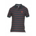 Black and red short sleeve polo neck t-shirt made of 100% cotton with horizontal pinstripes in black and red, vented hem, concealed button placket, ribbed collar and cuff, grey fabric tape on inseam of collar and embroidered logo on left chest
